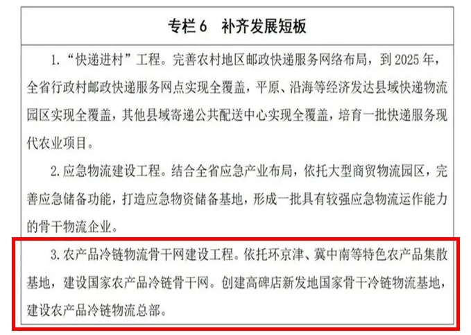 近日,河北省人民政府辦公廳發布《河北省建設全國現代商貿物流重要基地“十四五”規劃》(以下簡稱規劃)明確指出:為補齊發展短板,提升冷鏈物流服務品質,依托環京津,冀中南等特色農產品集散基地,建設國家農產品冷鏈骨干網。創建高碑店新發地(首衡智慧冷鏈)國家骨干冷鏈物流基地,建設農產品冷鏈物流總部。該規劃作為河北省未來五年發展的中長期規劃,對于區域產業布局具有重要指導意義。