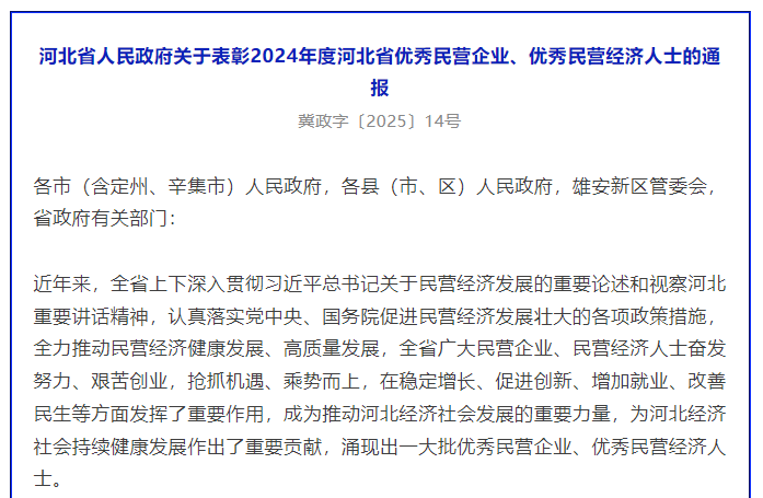4月29日,河北省人民政府發(fā)布《關(guān)于表彰2024年度河北省優(yōu)秀民營企業(yè)、優(yōu)秀民營經(jīng)濟(jì)人士的通報》,授予首衡集團(tuán)等100家知名企業(yè)“2024年度河北省優(yōu)秀民營企業(yè)”榮譽(yù)稱號。
