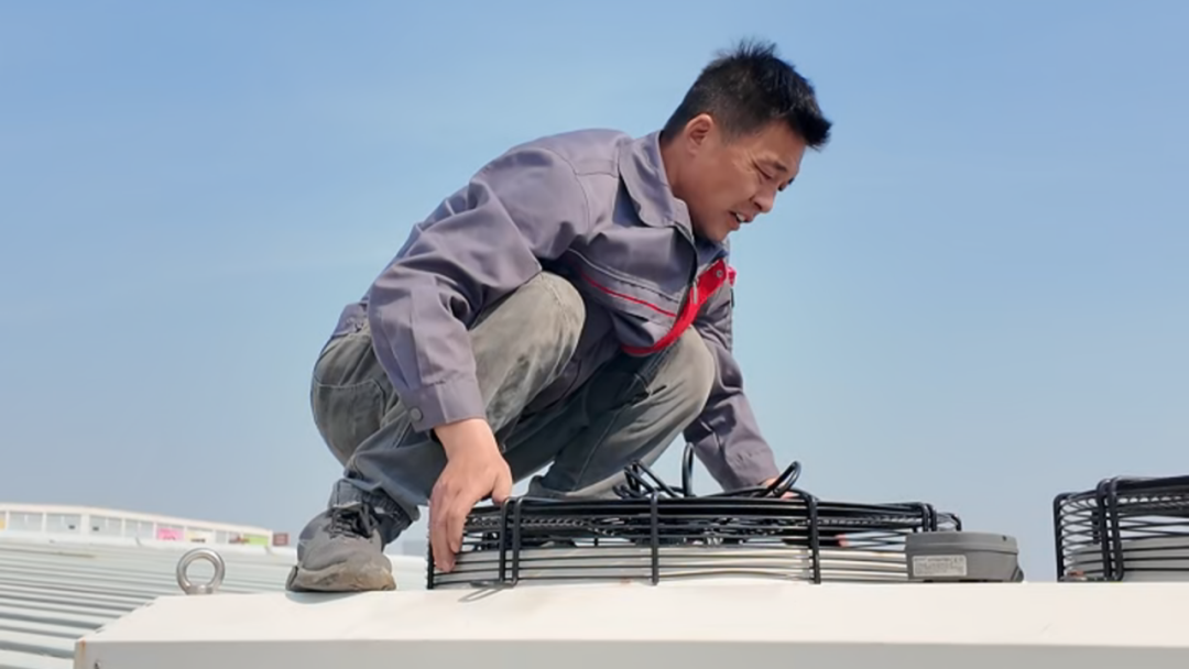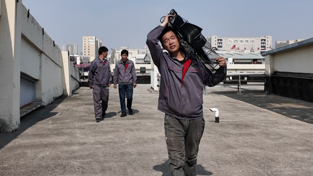 市場內相對舒適的環境,是無數努力的結果。工程維修組的師傅們,直面著更為嚴酷的戰場。在悶熱難耐的機房、在散發著滾滾熱浪的設備旁,他們專注地檢修制冷機組,更換老舊的風扇。最艱苦的莫過于戶外高空作業——地表溫度高達五六十度,他們仍需攀爬三米的云梯到頂層,一絲不茍地進行檢修。汗水如注,濕透衣衫,模糊了視線,卻模糊不了他們保障商戶清涼經營環境的決心。