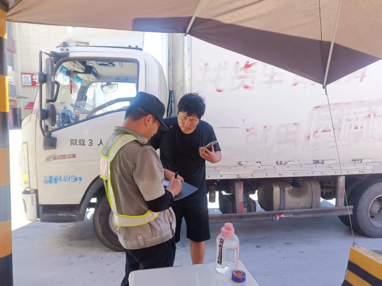 崗亭鐵皮頂被曬得通紅,安防員陳建平站在崗亭陰影里指揮車輛,他接過司機遞來的派車單時,單據邊緣已被引擎蓋烤得微卷。"鄂AXXXX,生鮮綠色通道,放行!"他按下遙控器的瞬間,金屬按鍵燙得指腹發麻,而抬桿電機的嗡鳴聲中,滿載西瓜的貨車正碾過滾燙的減速帶,輪胎與地面摩擦迸出細碎火星。