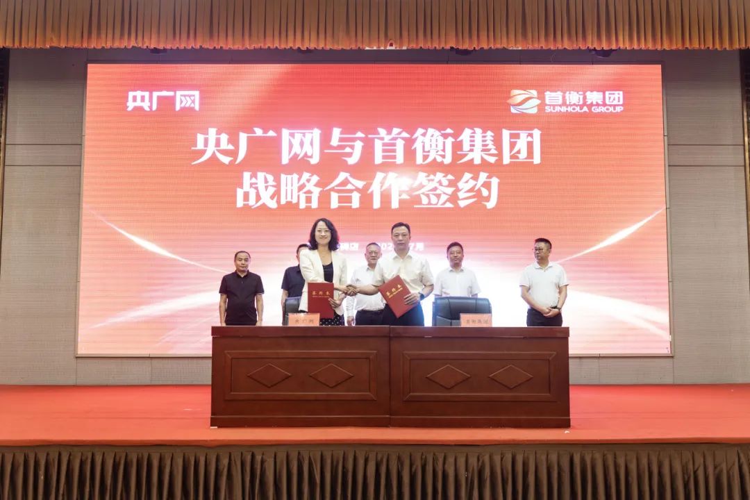 活動期間,首衡集團(tuán)黨委書記、總裁魏樹儉與央廣網(wǎng)副總裁宮歆慧進(jìn)行現(xiàn)場簽約。央廣傳媒集團(tuán)黨委書記、董事長、總經(jīng)理王躍進(jìn),央廣傳媒集團(tuán)黨委委員、央廣網(wǎng)總裁于鋒,高碑店市市長賈文征,首衡集團(tuán)董事長米亞林與首衡集團(tuán)常務(wù)副總裁伍彥見證簽約。