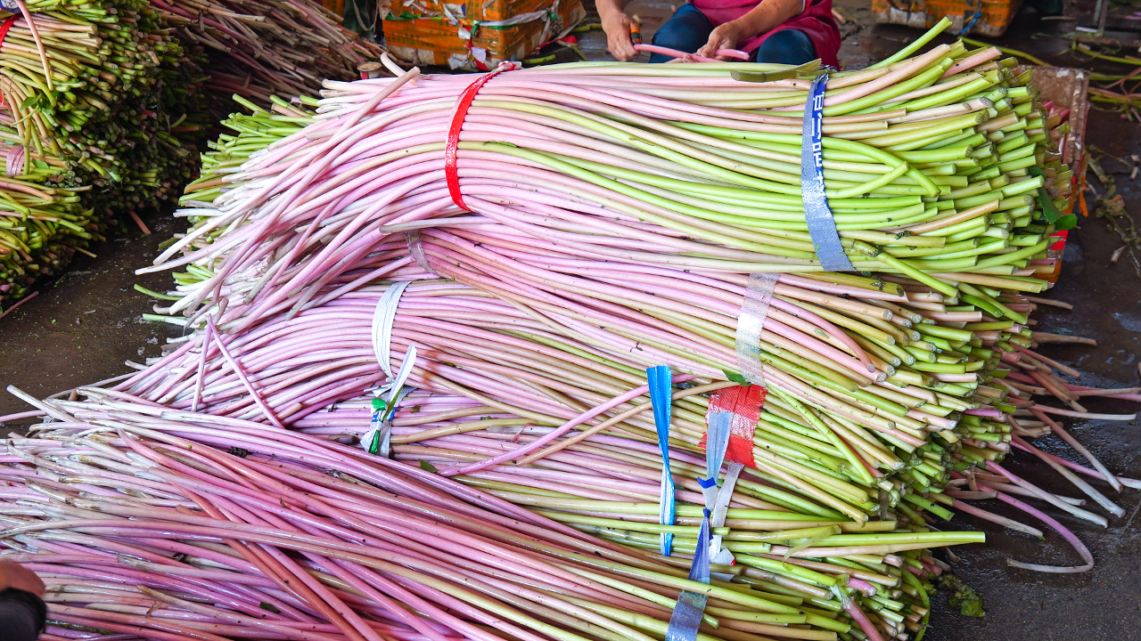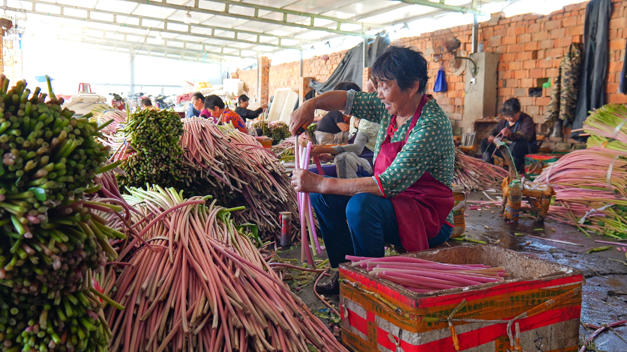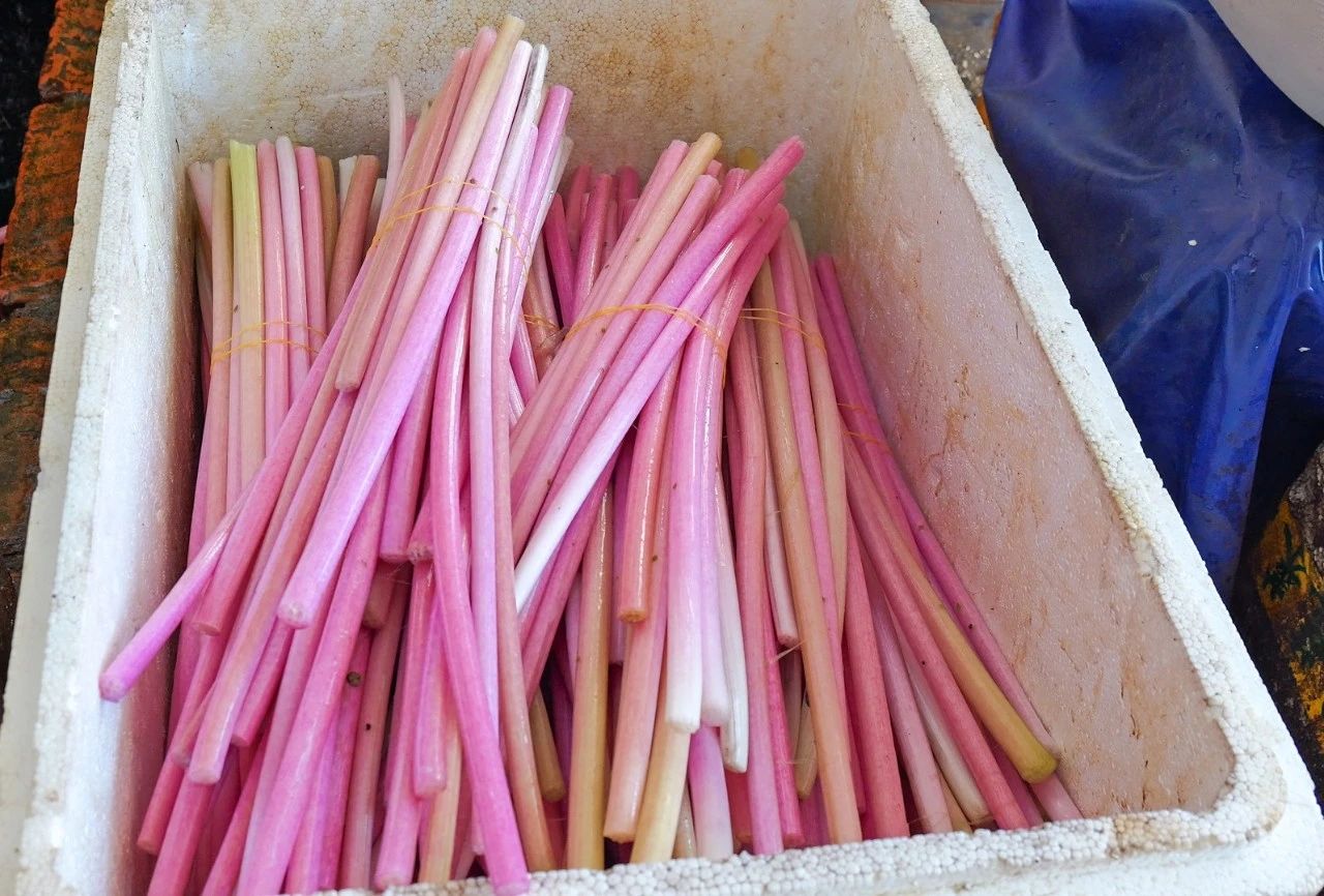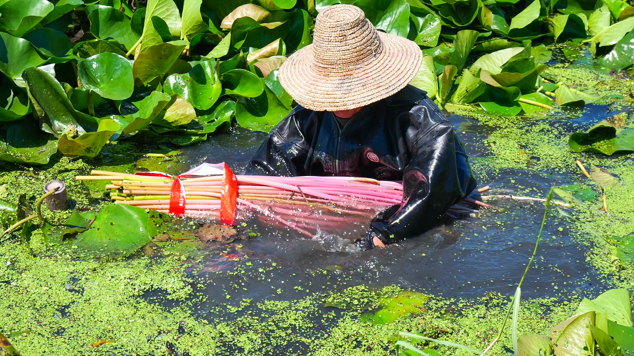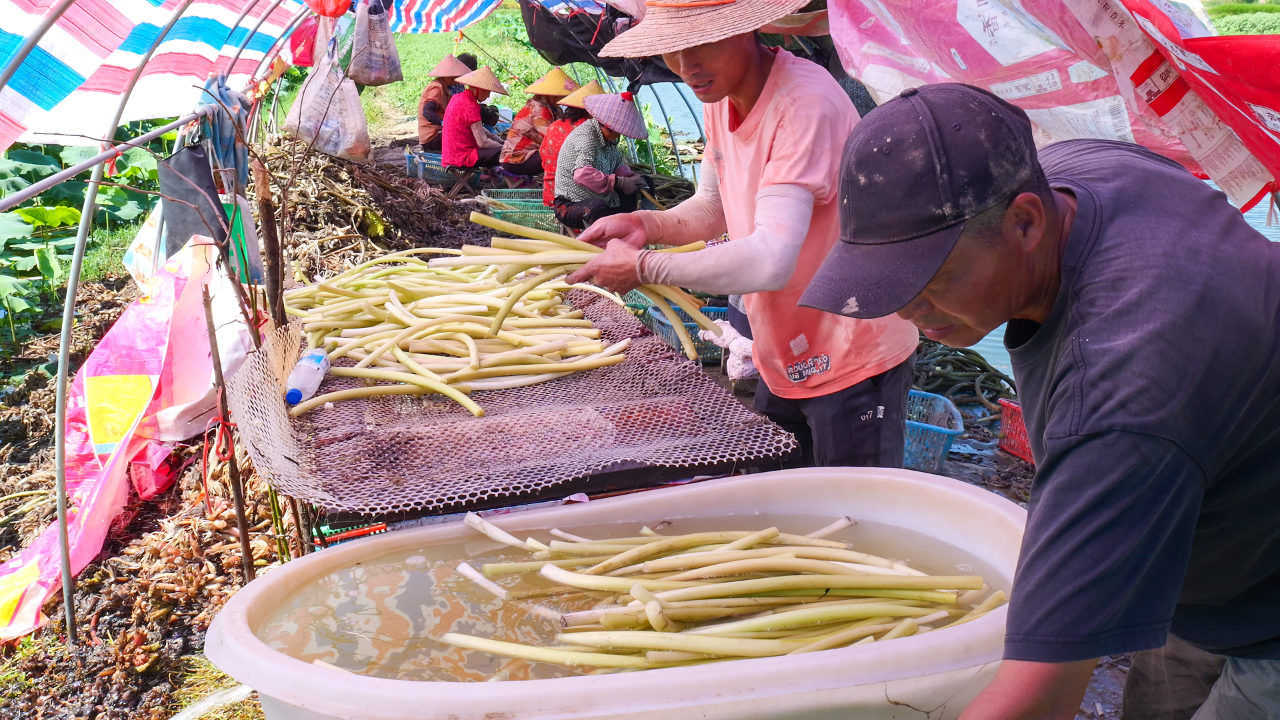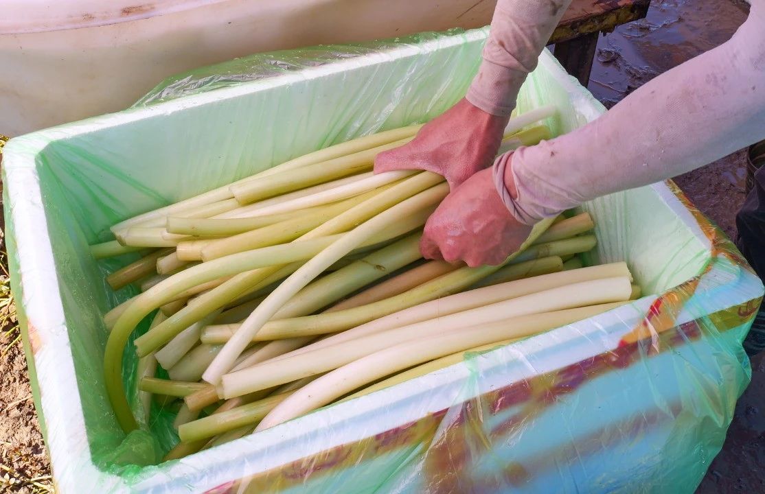“睡蓮梗4月中旬上市,口感更甜,很多客戶提前訂貨;雞頭梗6月上市,適合爆炒,走量更快。可以賣到10月,接檔藜蒿上市。”王麗一邊指揮工人分揀打包,一邊向客戶介紹。檔口前,不少采購商表示,這些水生蔬菜“新鮮度肉眼可見”,回購率極高。