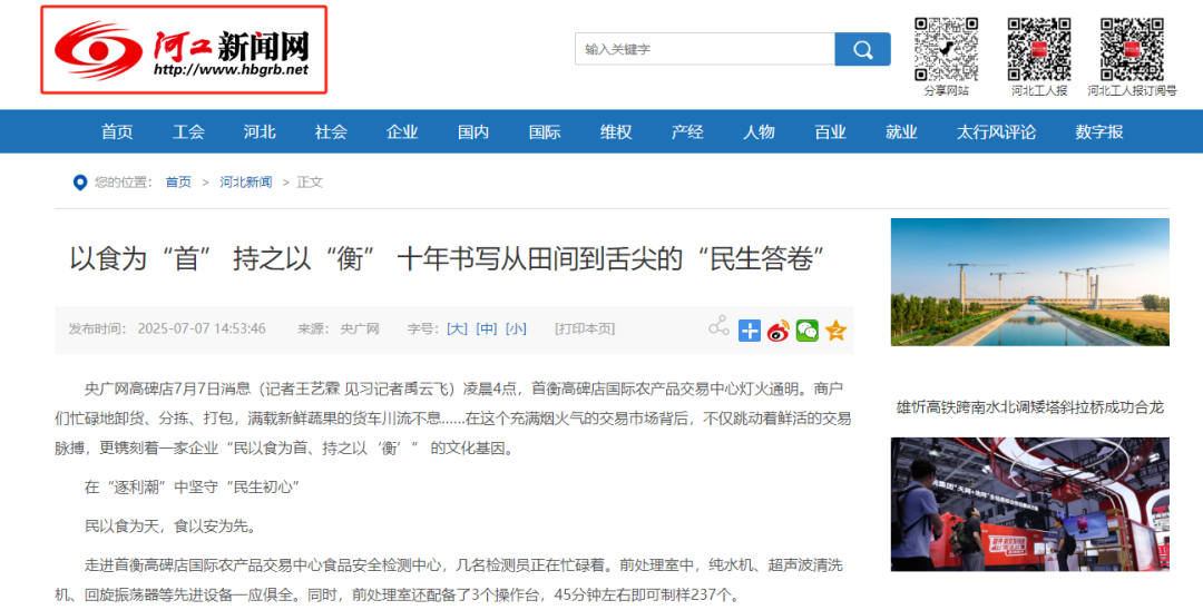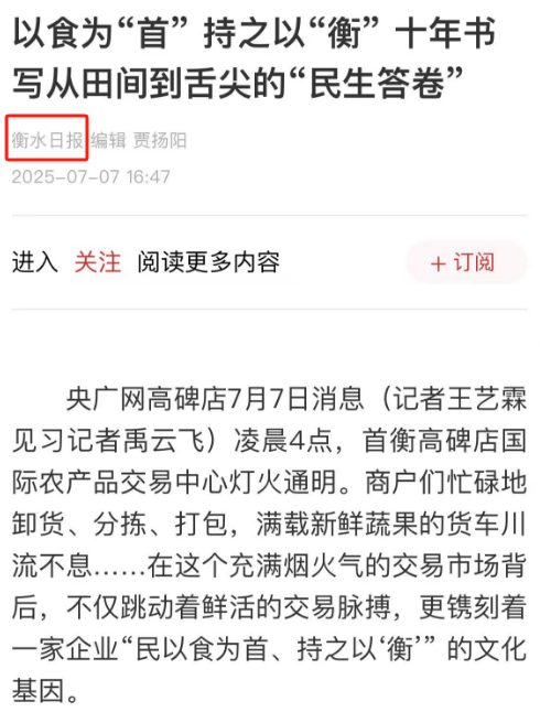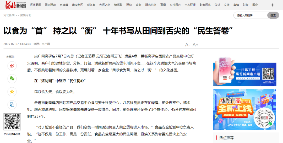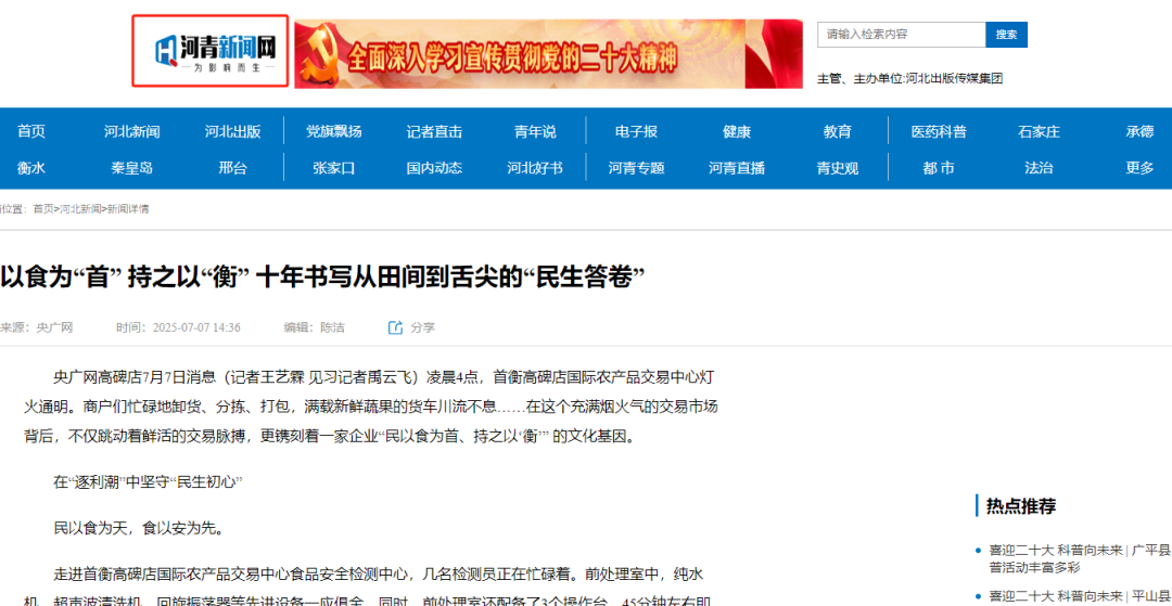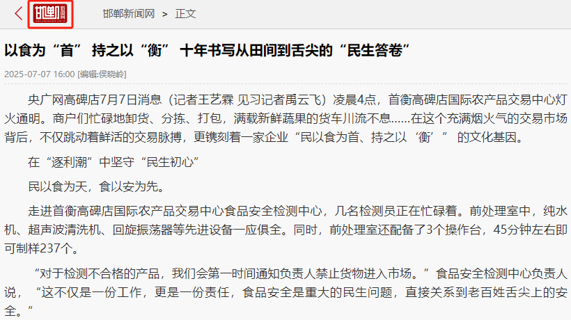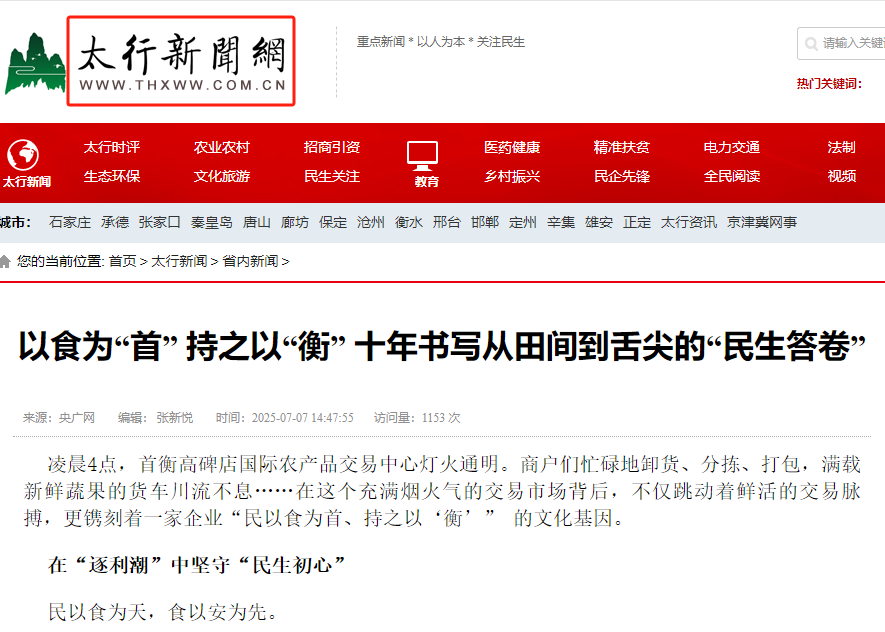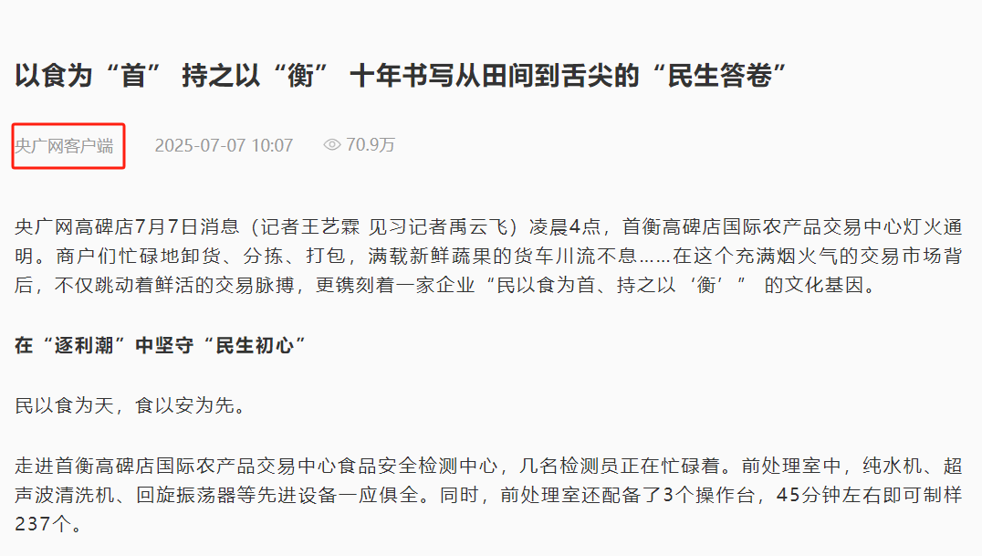 近日,一篇題為《以食為“首” 持之以“衡” 十年書寫從田間到舌尖的“民生答卷”》的新聞報道,得到20多家各級主流媒體的關注和廣泛傳播。報道稱:首衡在“逐利潮”中堅守“民生初心”,在“快時代”里深耕“慢產業”,在謀發展中展“首衡擔當”。該報道截至目前瀏覽量已突破2000萬+。