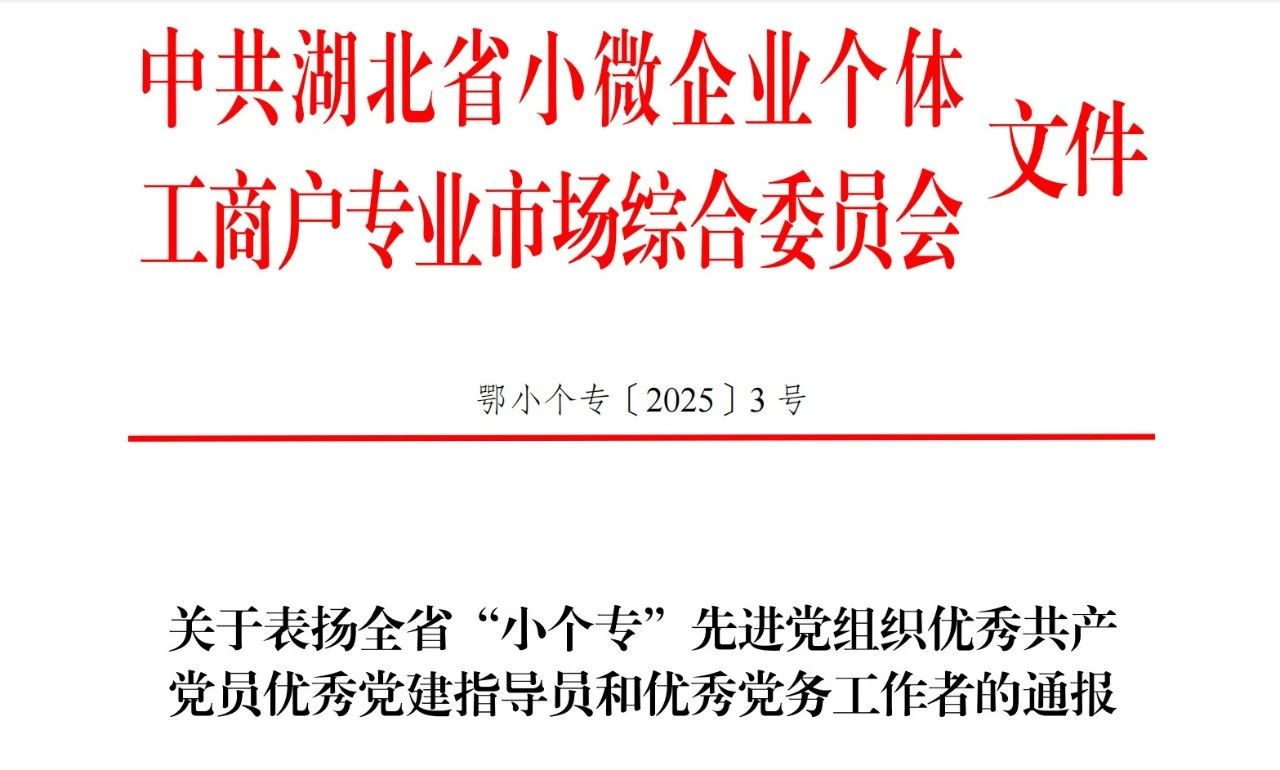 近日,省“小個專”綜合黨委印發通知,通報表揚全省“小個專”先進黨組織、優秀共產黨員、優秀黨建指導員和優秀黨務工作者,中共湖北首衡農產品有限公司委員會榮獲全省“小個專”先進黨組織稱號。