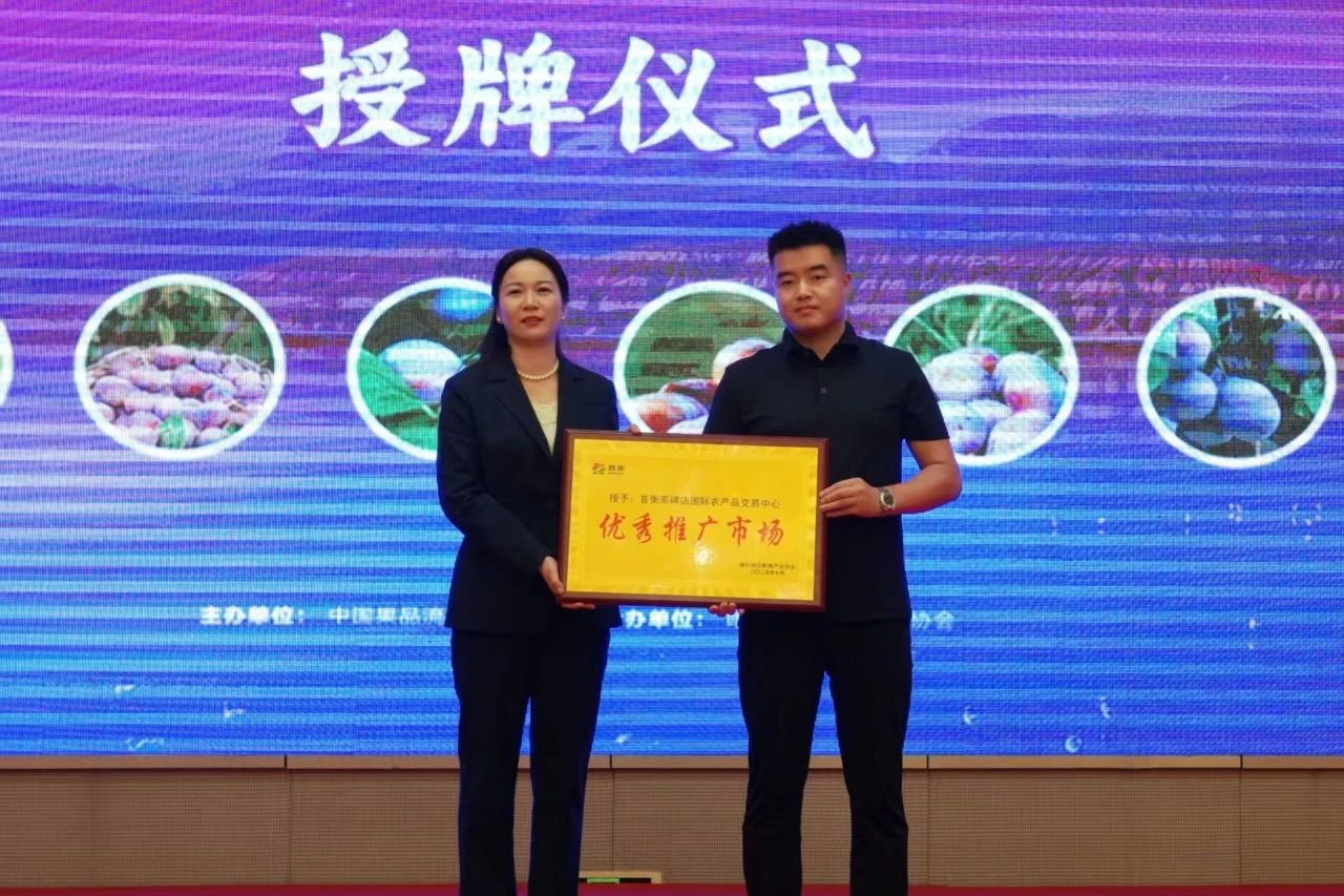 緊接著,喀什地區(qū)新梅產(chǎn)業(yè)協(xié)會(huì)秘書(shū)長(zhǎng)謝琪向首衡高碑店市場(chǎng)授予“優(yōu)秀推廣市場(chǎng)”榮譽(yù)牌匾,首衡農(nóng)副公司總經(jīng)理米大帥上臺(tái)接受授牌。