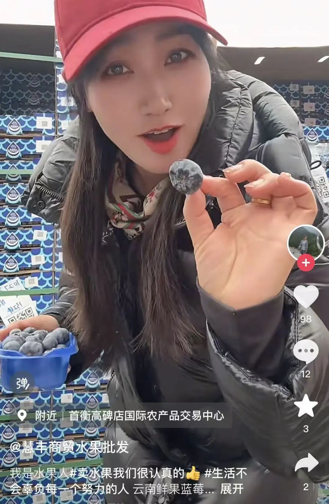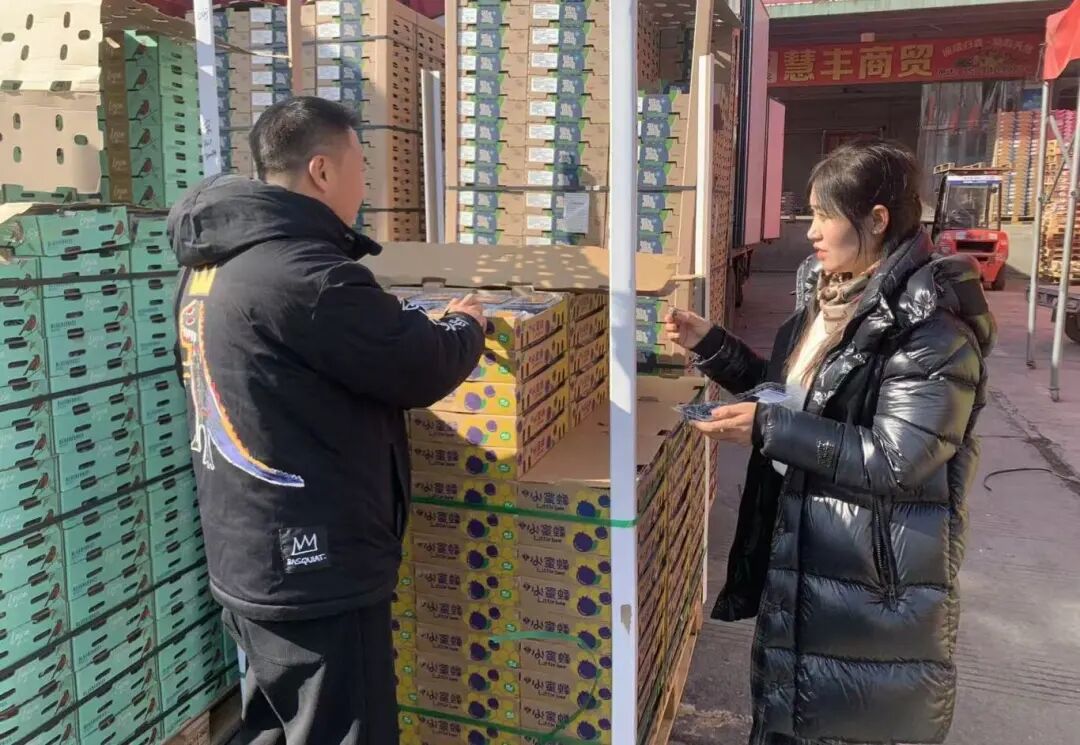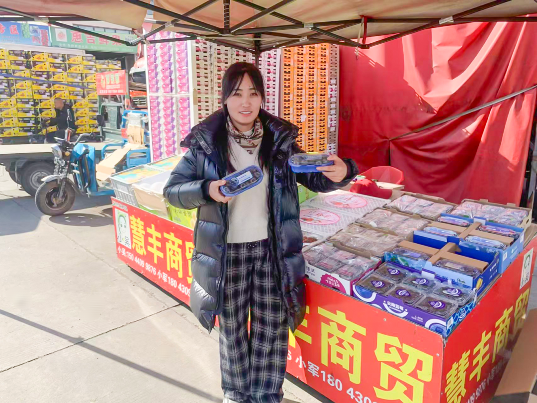 如今,她的檔口已升級為精品大檔口,配備專屬車位與獨立冷庫,團隊規模擴充至 20 余人,步入正規化運營軌道。經營品類也愈發豐富,主打草莓柿子、藍莓等核心產品,其中藍莓涵蓋國內各產區及進口貨源,能夠實現全年供應不斷檔,同時根據季節輪換,靈活引入山西玉露香梨、新疆西梅、四川紅脆李等時令鮮果;同時,形成了“產地直采+合作基地”的雙供應鏈模式,產品銷往京津冀、東三省、甘肅、寧夏、內蒙古等北方多省份。