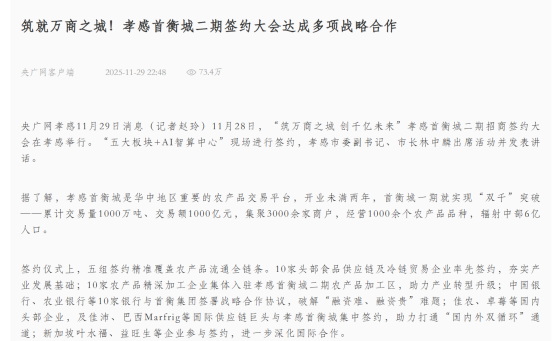 這場由中央媒體領銜、多級多類媒體協同的傳播浪潮,不僅完整呈現了孝感首衡城二期招商簽約大會的盛況,更從戰略高度、產業深度、民生溫度等多個維度,完成了一次對“首衡模式”及其發展成果的權威詮釋與價值認可。它向市場與公眾清晰地表明,首衡城正以堅實的運營基底和前瞻的產業布局,穩健邁向千億級食品商貿物流產業集群的新未來。