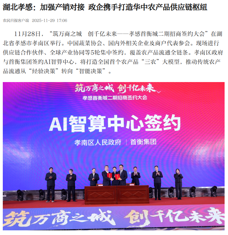 《農民日報》報道緊扣“三農”主題,強調首衡城通過授予核心產區“優秀推廣市場”、構建全鏈路體系,有效加強了產銷對接。
