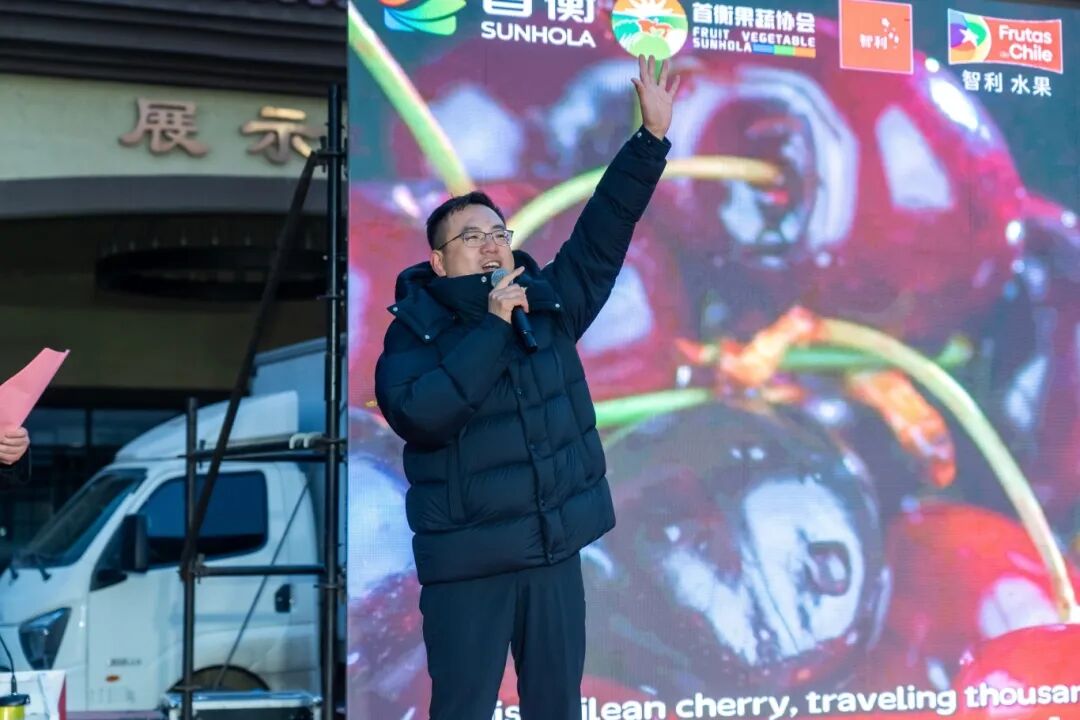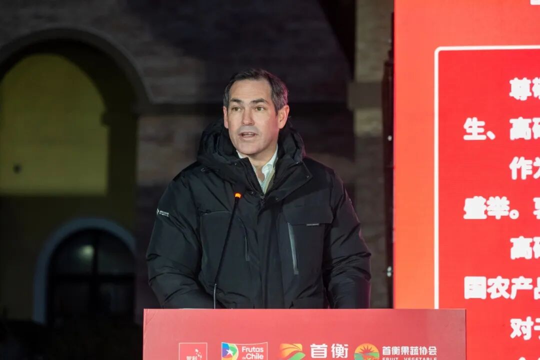 活動在熱烈的氛圍中拉開帷幕。智利駐華大使館商務參贊安德烈斯·格鮑爾首先上臺致辭。他盛贊高碑店市場作為“國家供應鏈的戰略核心引擎”的重要地位,并透露了振奮人心的行業數據:2025/2026產季,智利車厘子預計總產量將達65.5萬噸,其中超90%將供應中國市場。他表示,智利方面將持續優化物流、加強推廣,與中方伙伴攜手,將更新鮮、更優質的智利車厘子高效送達中國消費者手中。