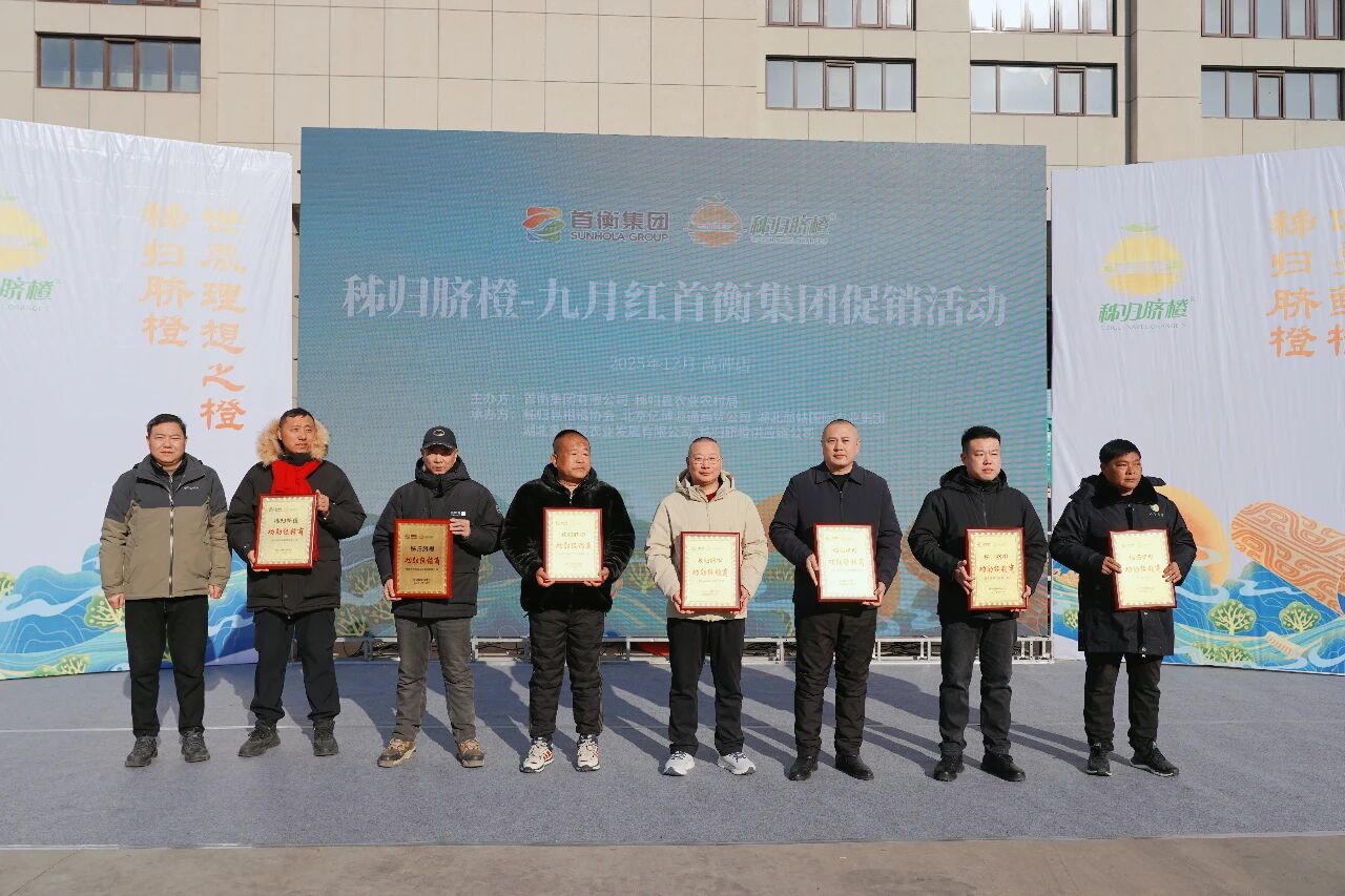 此外,秭歸縣柑橘協會為二喜佳果、鑫永旺商貿有限公司、高碑店市永泰商貿有限公司、億博源通商貿有限公司、高碑店鼎鮮匯商貿有限公司、保定佰利福商貿有限公司授予“秭歸臍橙功勛經銷商”榮譽牌匾。