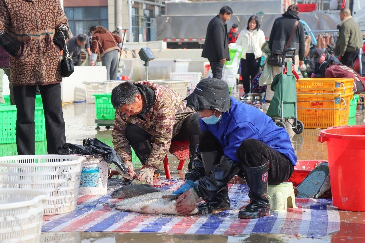 走進水產交易區,一個個水箱里的青魚、草魚活力滿滿,不時濺起水花。商戶們正忙著稱重、打包、裝車,手腳麻利不停歇。