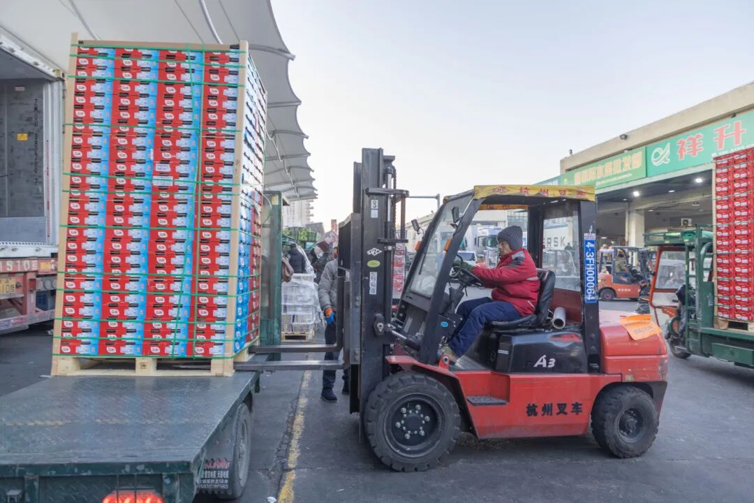 上午9時(shí),首衡高碑店市場(chǎng)的進(jìn)口果交易區(qū)一派繁忙景象。放眼望去,各家主營(yíng)車?yán)遄拥臋n口前都聚攏著采購(gòu)人群,員工們正麻利地開箱、分揀、搬貨。通道中,載滿標(biāo)準(zhǔn)果板的叉車往來穿梭,運(yùn)輸效率決定著當(dāng)天的交易節(jié)奏。