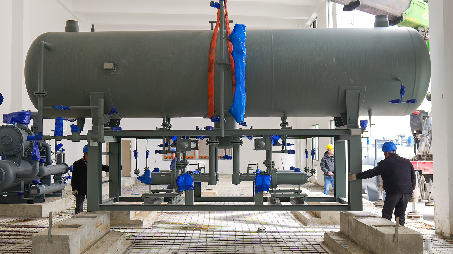 當前,設備安裝工作已多點展開:冷藏間橫擔安裝全部完成,排管進場完工率達80%,施工全程標準化作業;制冷機房內,桶泵、撬塊等已就位,多臺行業領先規格的壓縮機與蒸發冷等關鍵設備正同步安裝。整套系統搭載智能控制系統,可實現溫濕度精準調控,兼顧運行高效與綠色環保。